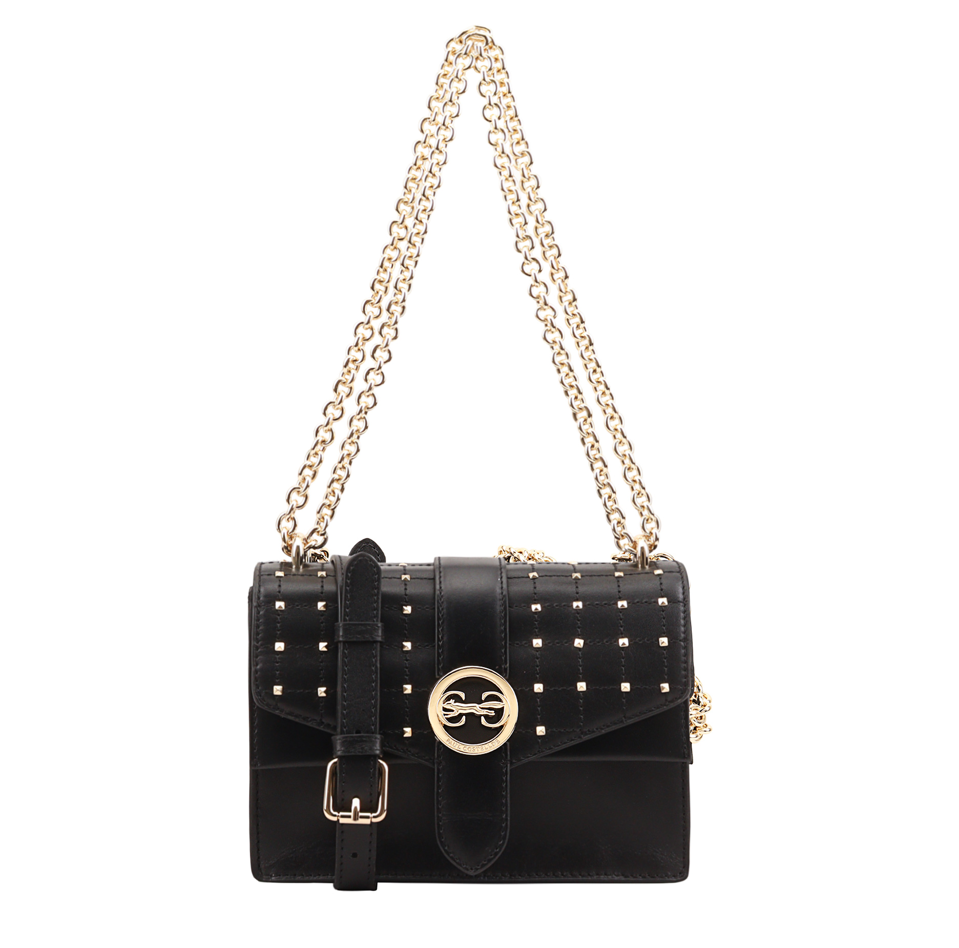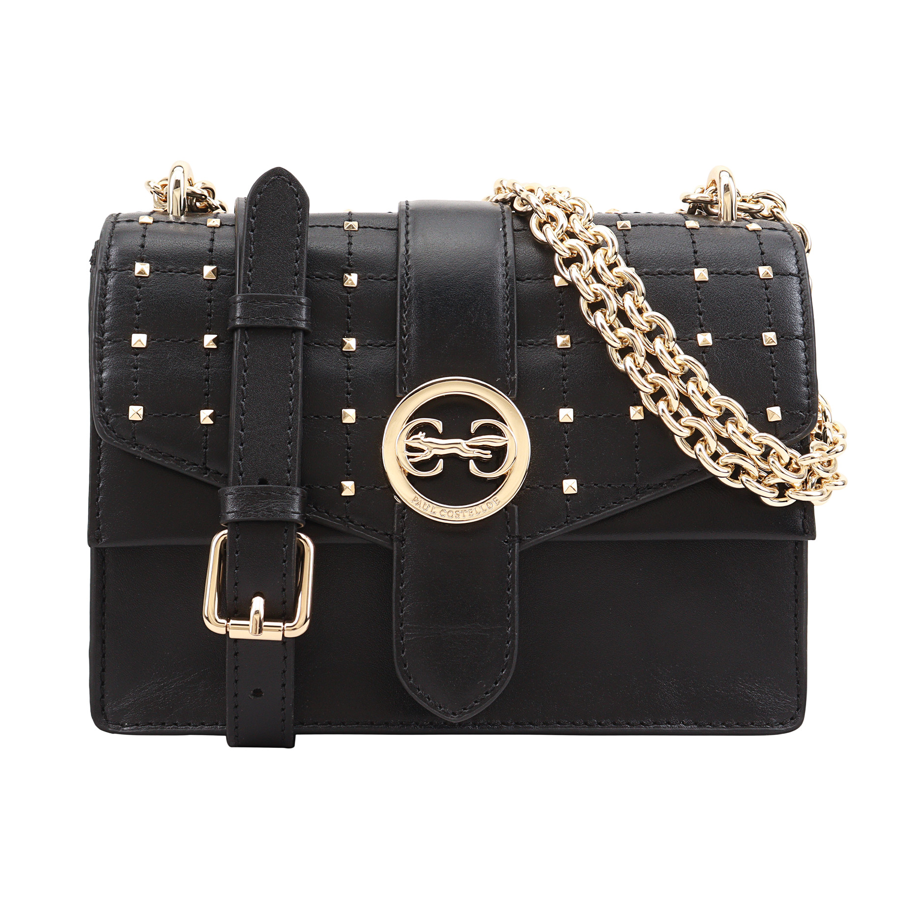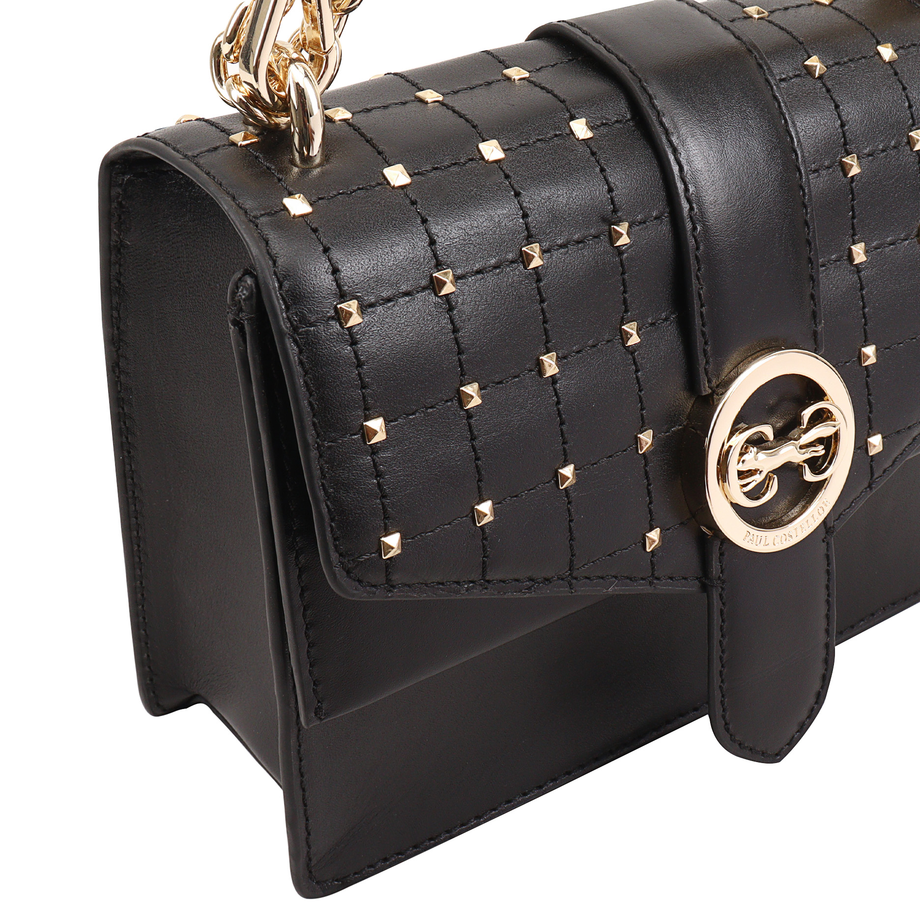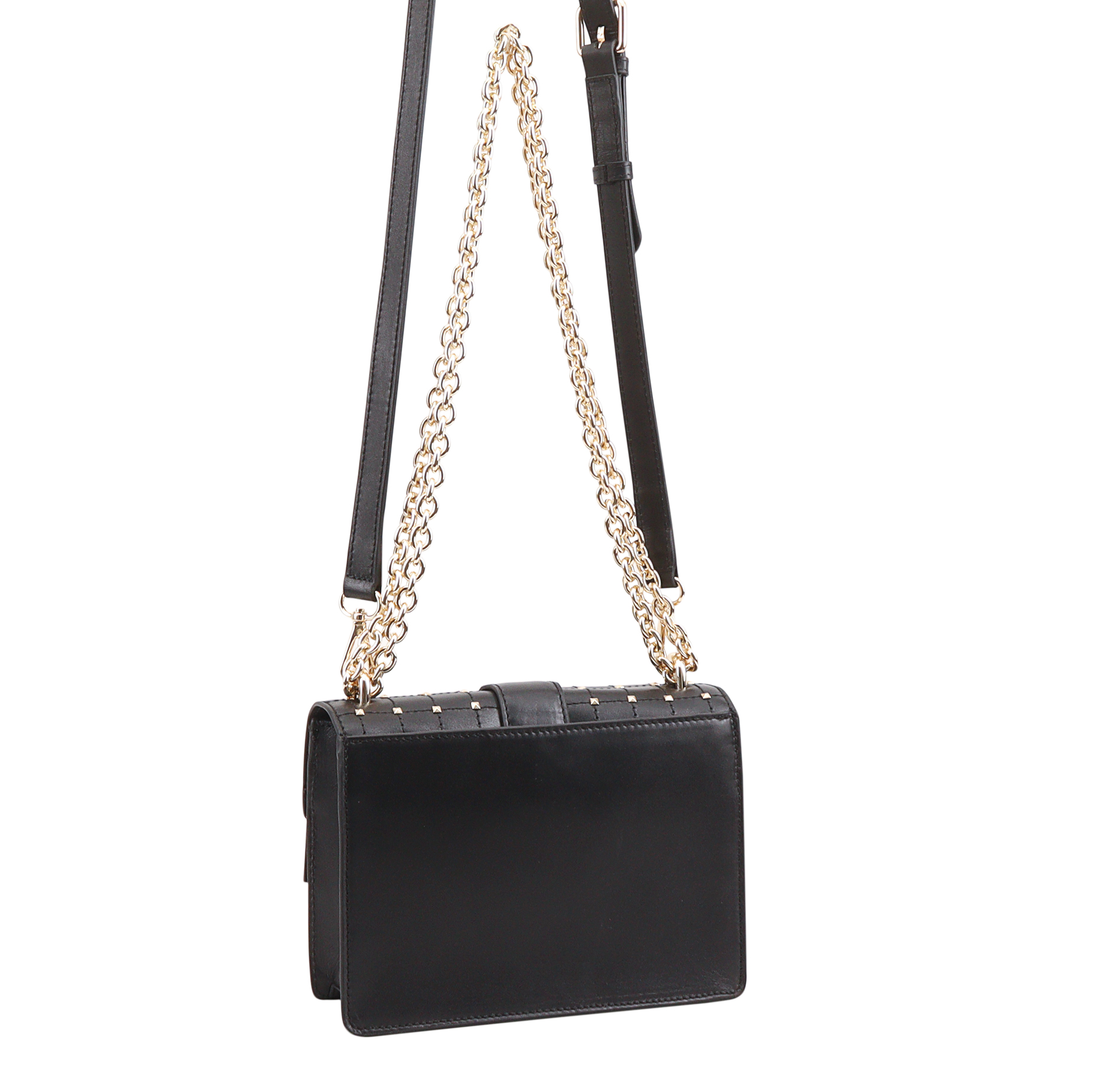 Elevate your evening ensemble with this leather crossbody bag that exudes both glamour and versatility. The elegant chain shoulder strap adds a touch of sophistication, while studs on the cross-stitched front flap provide a chic and textured aesthetic.