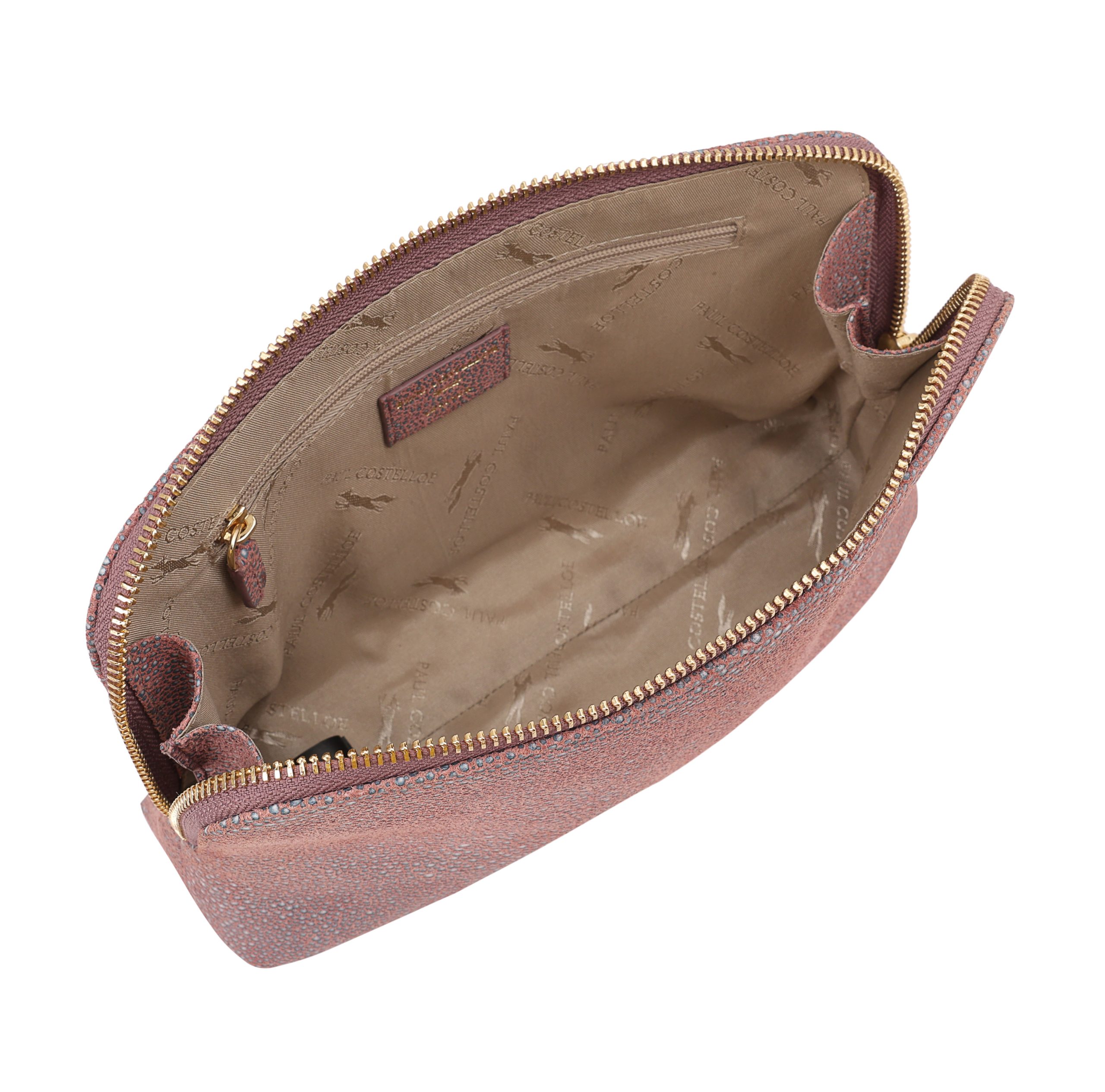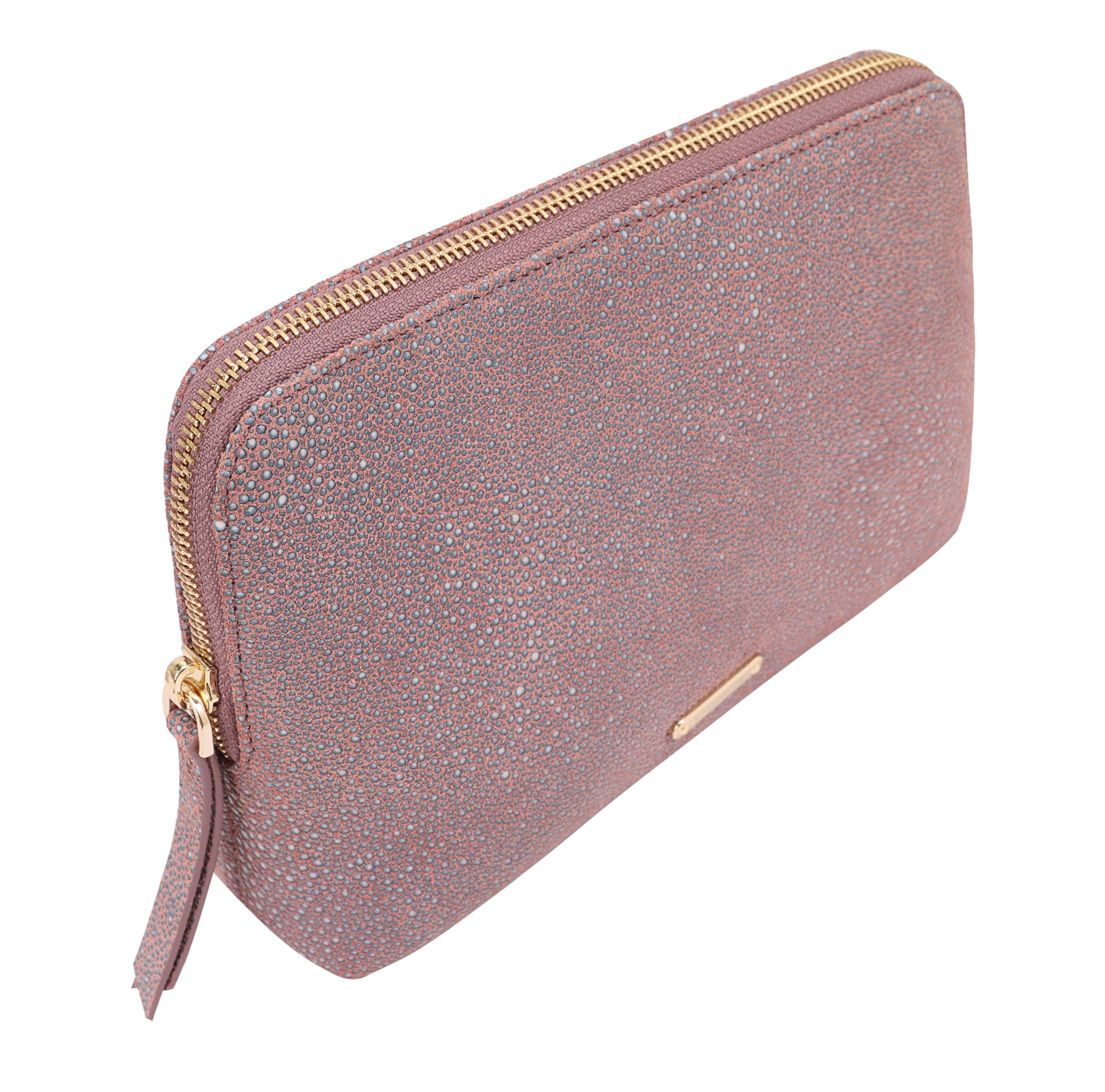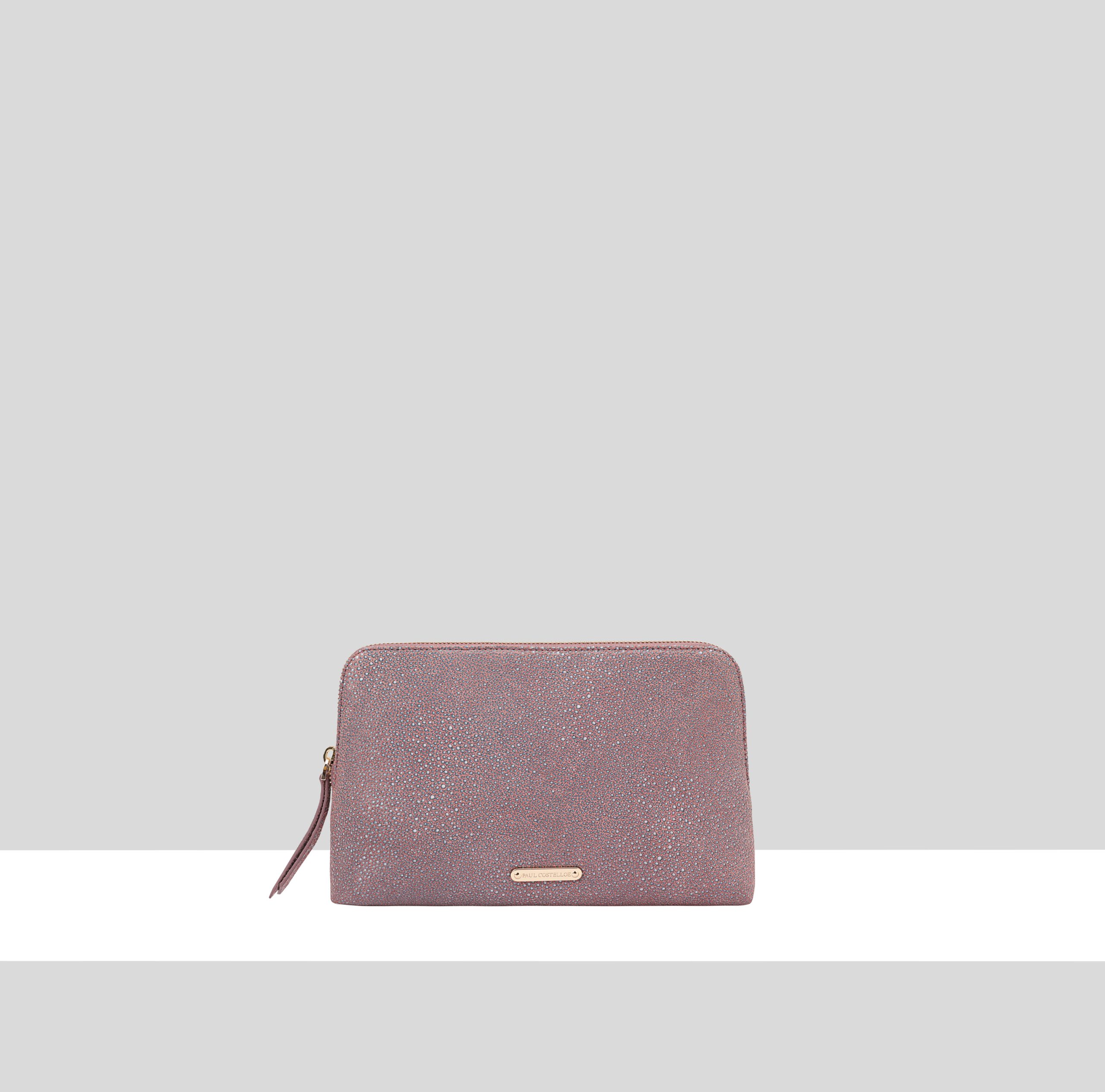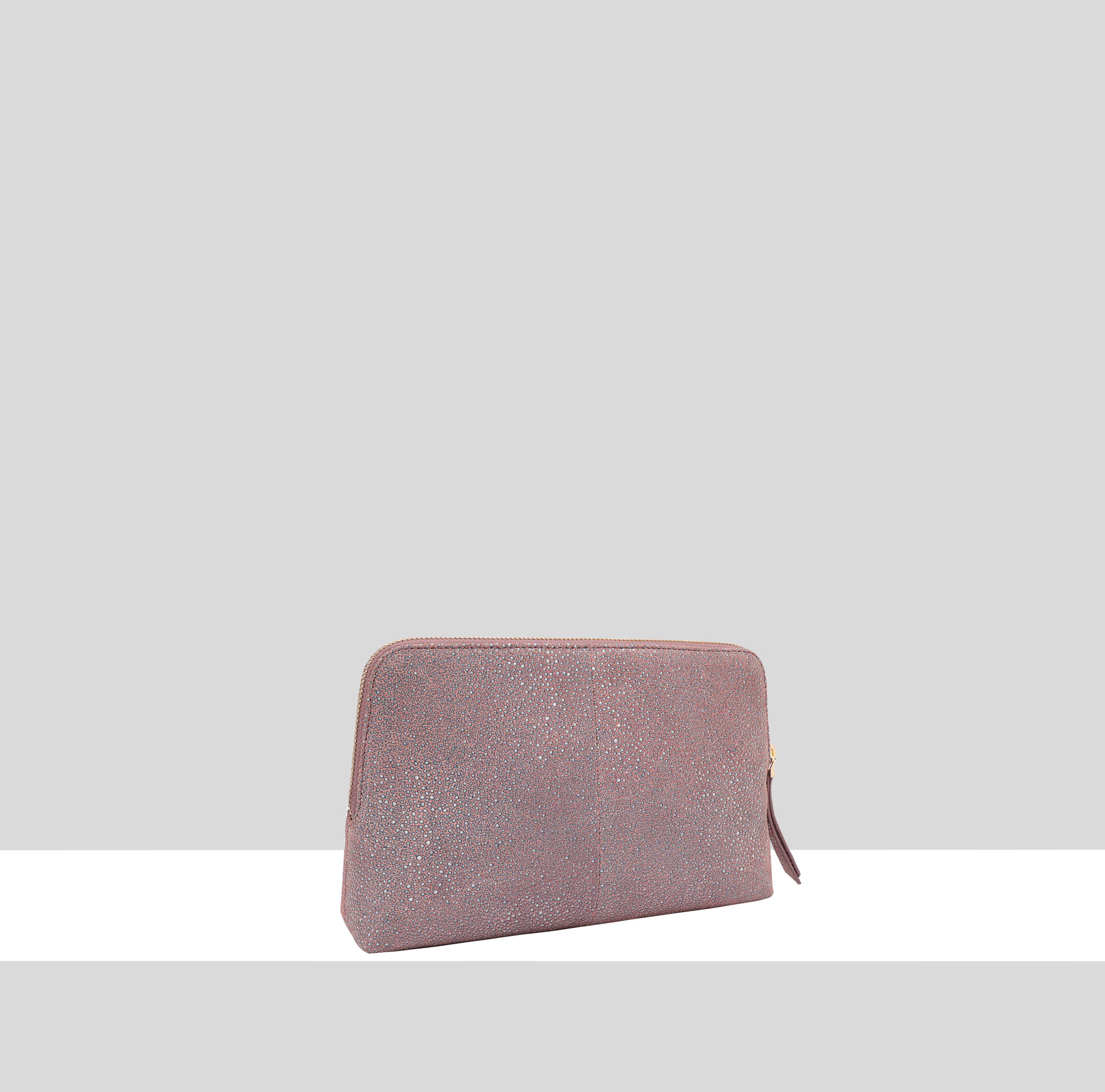 A refined rectangular pouch crafted from premium soft textured leather, offering a clean, spacious interior to hold all essentials, complete with an internal zipped pocket for extra organization. Accented with a sleek metal logo bar on the front, this elegant pouch is ideal for travel, combining sophisticated style with practical functionality.