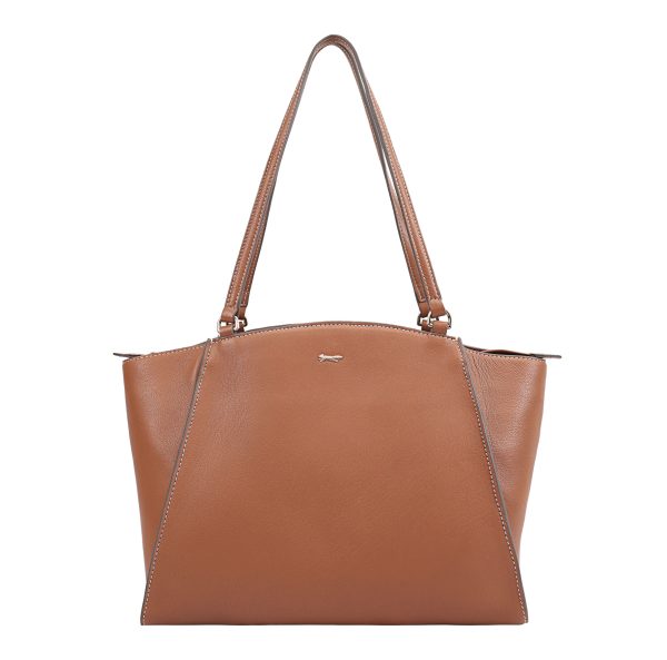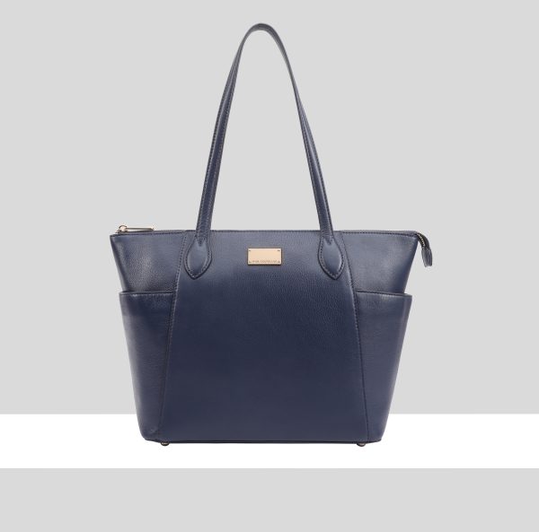 - 58 % Off £189.00Original price was: £189.00.£79.00Current price is: £79.00.This uniquely shaped leather tote bag combines elegance with practicality, featuring a spacious central compartment secured by a top zip, perfect for work or casual outings. It offers convenient organization with external slip pockets on both sides, an internal zip pocket, and an additional slip pocket inside. Designed for comfort, the long shoulder handles make it easy to carry all day, while the clean silhouette is elevated by a sleek metal logo pin for a touch of refined style. D:18cm W:42.5cm H:27.5